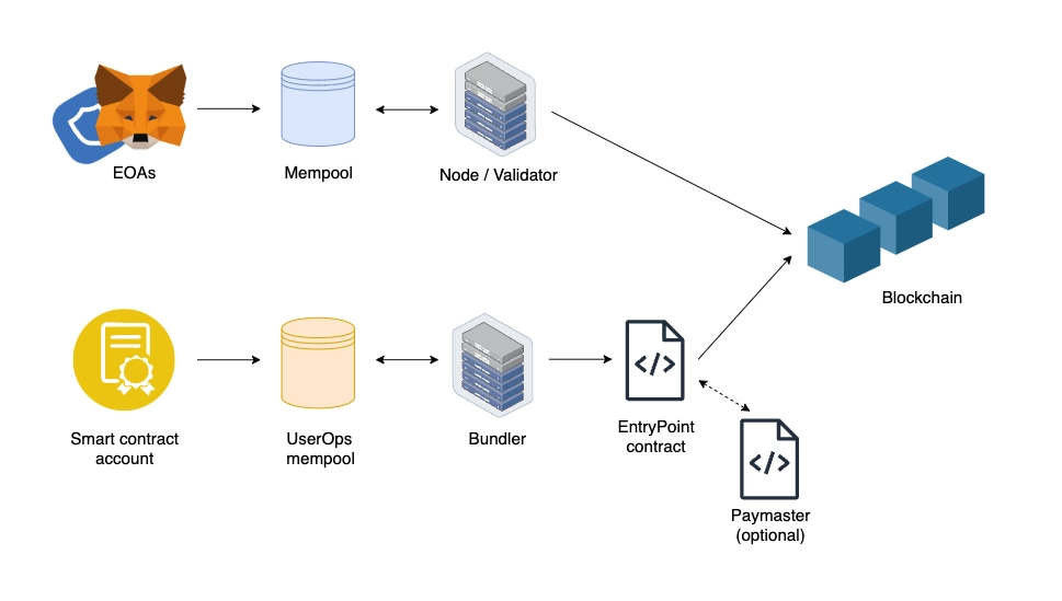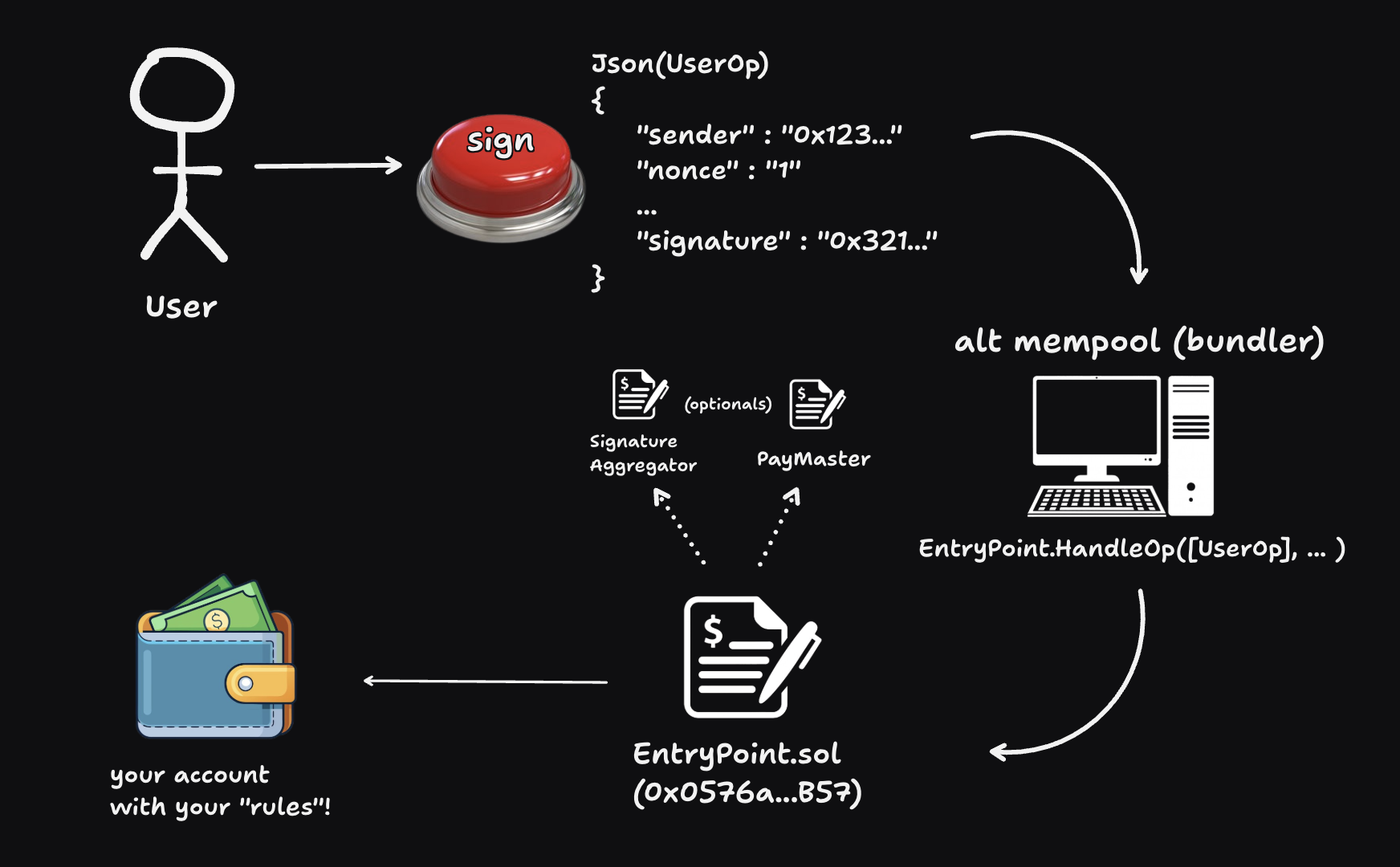 Paymaster (optional) : The paymaster is basically the entity that pays the gas for the UserOperation, replacing the requirement that the account must hold ETH.