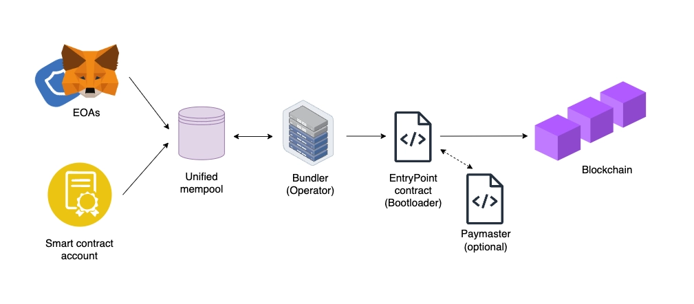 - In ZKsync, there is one unified mempool and transaction flow: all EOAs are smart contracts. Compared to Ethereum, the operator here plays the role of both validator and bundler: